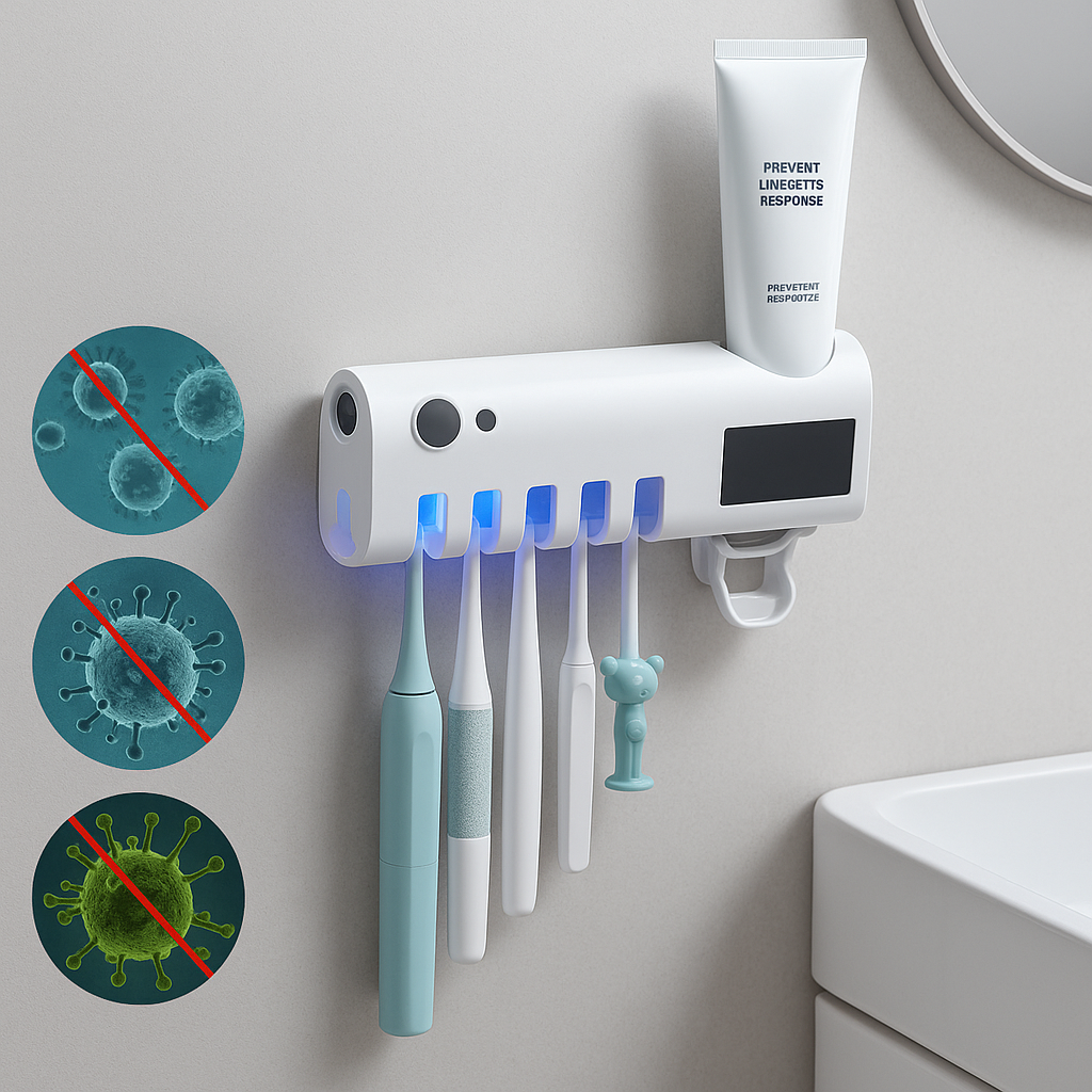 El baño es un lugar lleno de bacterias. Los inodoros llenan el ambiente de suciedad Y NO NOS DAMOS CUENTA. Nuestro esterilizador organiza los cepillos y elimina el 99.99% de los gérmenes.