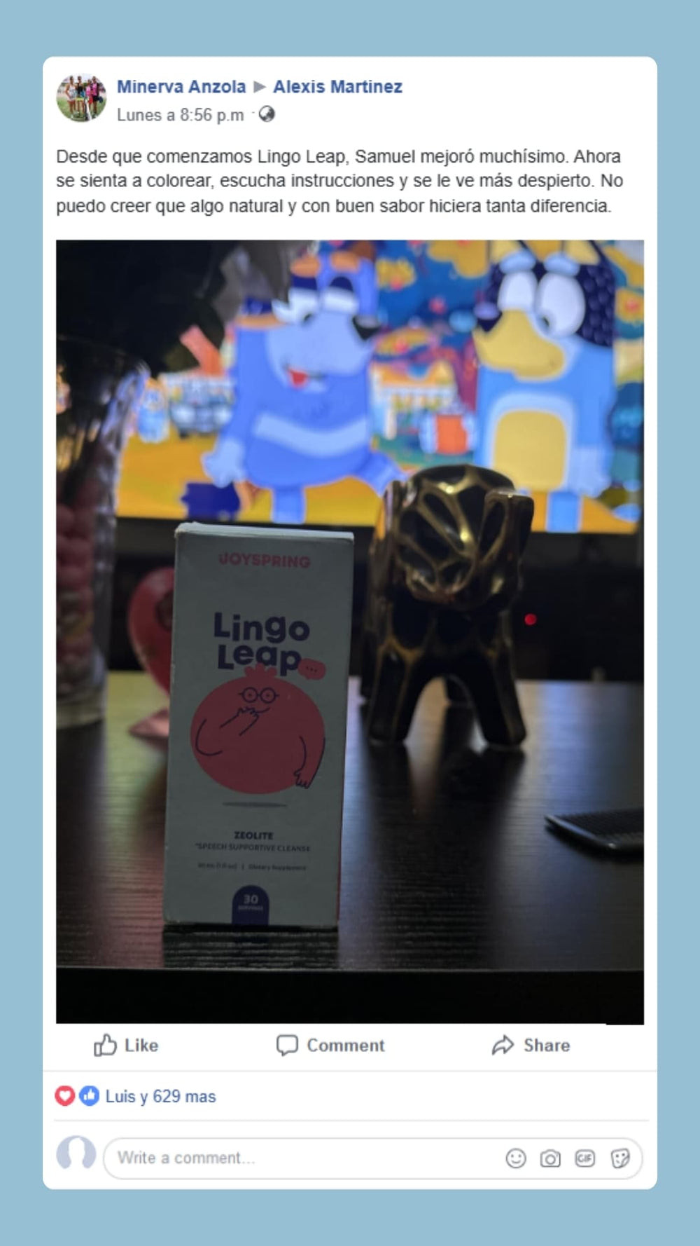 Lingo Leap es un suplemento natural de apoyo, no un medicamento. Está diseñado para complementar la nutrición y favorecer el desarrollo cognitivo y del lenguaje, sin sustituir ningún tratamiento médico.